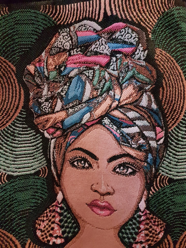 Grand sac type tote bag, confectionné à partir de carré jacquard au motif coloré "Mama Africaine"